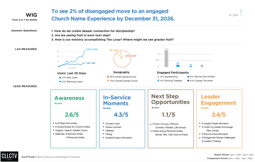 While serving with the church marketing and communications team we put in place a WIG (Wildly Important Goal) Dashboard to track exactly that. One clear objective: “To see 2% of disengaged individuals move into an engaged church experience by December 31.”