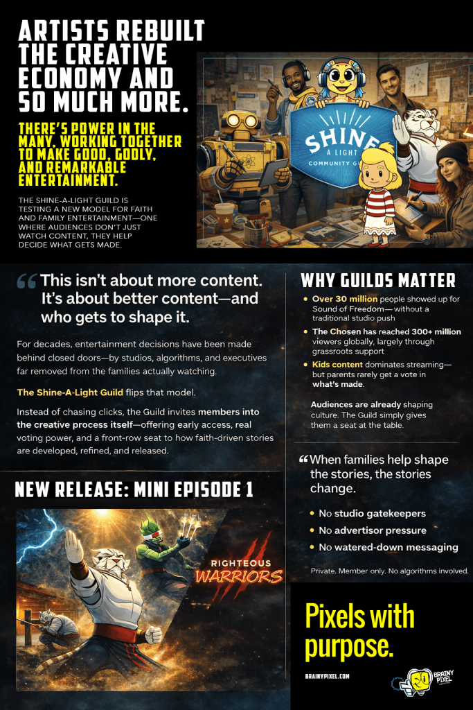 There’s a familiar myth in the creative industries: great work comes from big budgets, elite gatekeepers, and a velvet rope guarded by algorithms and executives who “get it.” But every so often, a counter-story slips through the cracks—one built not on scale, but on faith, collaboration, and the stubborn belief that good stories still matter. That’s the quiet revolution taking shape inside Shine-A-Light Guild, a growing community of artists, writers, animators, and storytellers banding together with Brainy Pixel Animation Studios to make content that’s thoughtful, spiritually grounded, and—here’s the real heresy—actually fun. This isn’t nostalgia bait or Sunday-school reruns with better lighting. It’s a design-minded, creator-driven experiment in what happens when you stop waiting for permission and start pouring what you already have.