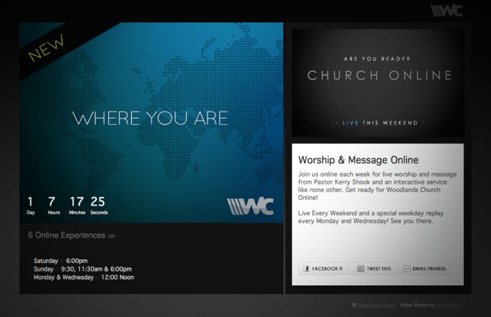 Or if you are elsewhere join us for our BETA test of Church Online and let us know what you think. http://live.woodlandschurch.tv/ Saturday 6:00pm or Sunday 9:30, 11:00am or Wednesday at 9:00am.